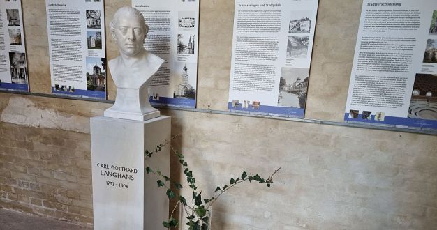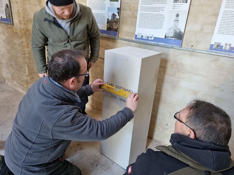 am 28. März 2023 konnten wir die Langhans-Büste in der Langhans-Gedenkstätte einweihen. Die Steinmetzwerkstätten Knurbien waren als Fachfirma mit der Aufstellung des Sandsteinsockels und der Büste beauftragt. Den Nachguß der Büste hatte die Gipsformerei der Staatlichen Museen zu Berlin, Preußischer Kulturbesitz, nach einer in der Gipsformerei aufbewahrten Form besorgt. Das Marmororiginal der Büste (um 1790) ist vermutlich 1945 in der Technischen Hochschule Charlottenburg, dem letzten Aufstellungsort, untergegangen. Der Nachguß der Büste konnte nur dank großzügiger Spenden finanziert werden. Auch der Sockel aus schlesischem Sandstein wurde uns von der Firma Zeidler & Wimmel, Natursteinlieferanten und Steinmetze aus Berlin seit 1776, gespendet.
